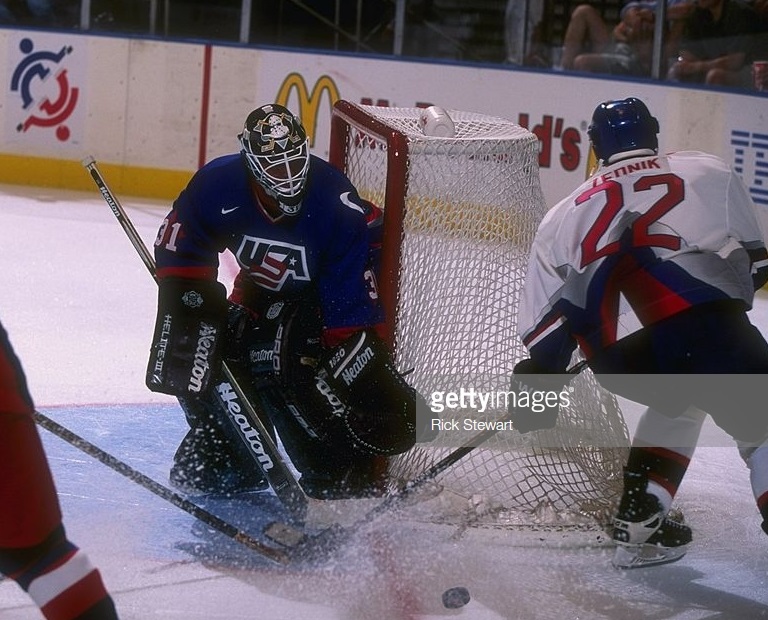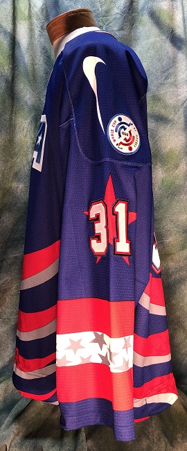 Fantastic jersey worn during a pre-tournament game on August 20, 1996: Team USA vs. Team Canada. Hebert would relieve Mike Richter and play the entire third period of a 3-1 loss against Team Canada stopping all three shots he faced. The game was played at General Motors Place in Vancouver, Canada